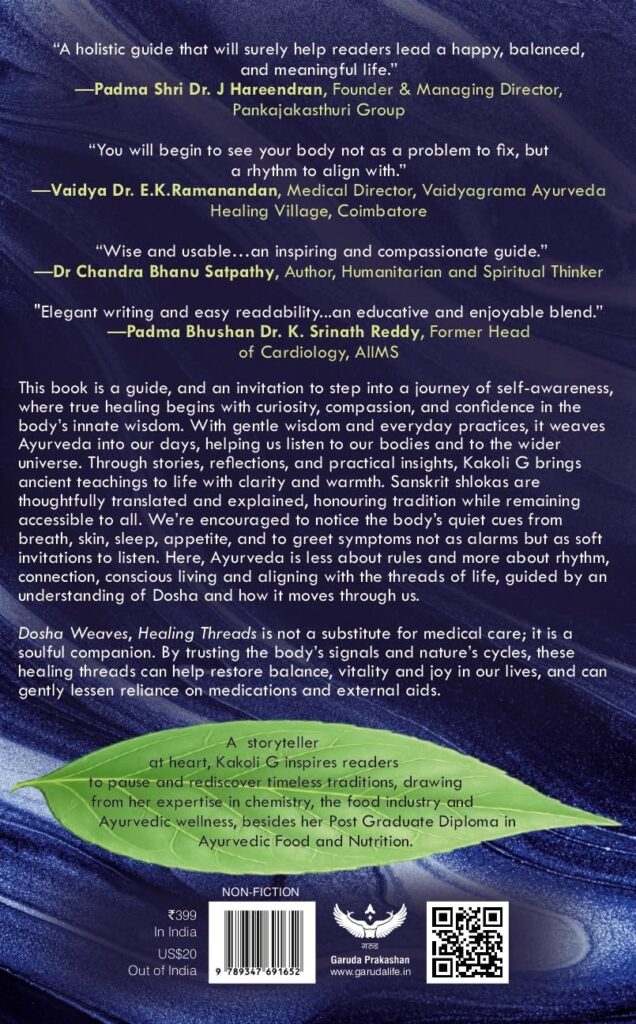 The book encourages us to notice the body’s quiet cues—breath, skin, sleep, appetite—and to greet symptoms not as alarms, but as soft invitations to listen. Here, Ayurveda is less about rigid rules and more about rhythm, connection, conscious living, and aligning with the threads of life, guided by an understanding of Dosha and how it moves through us.